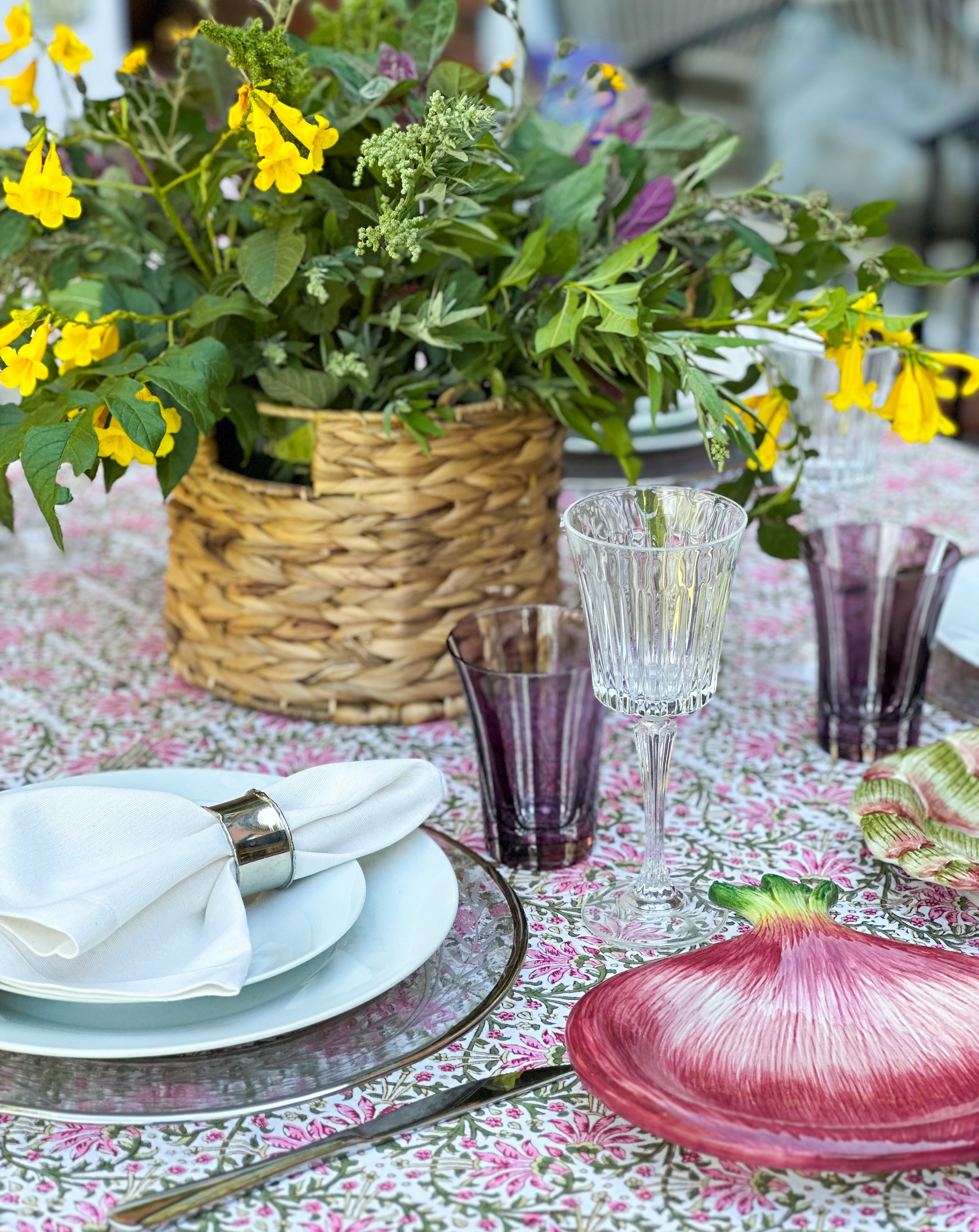 Esta mesa lleva un mantel de algodón que se puede combinar con muchas tonalidades. Las flores son de campo, lo que hace que el look sea original y al mismo tiempo casual.