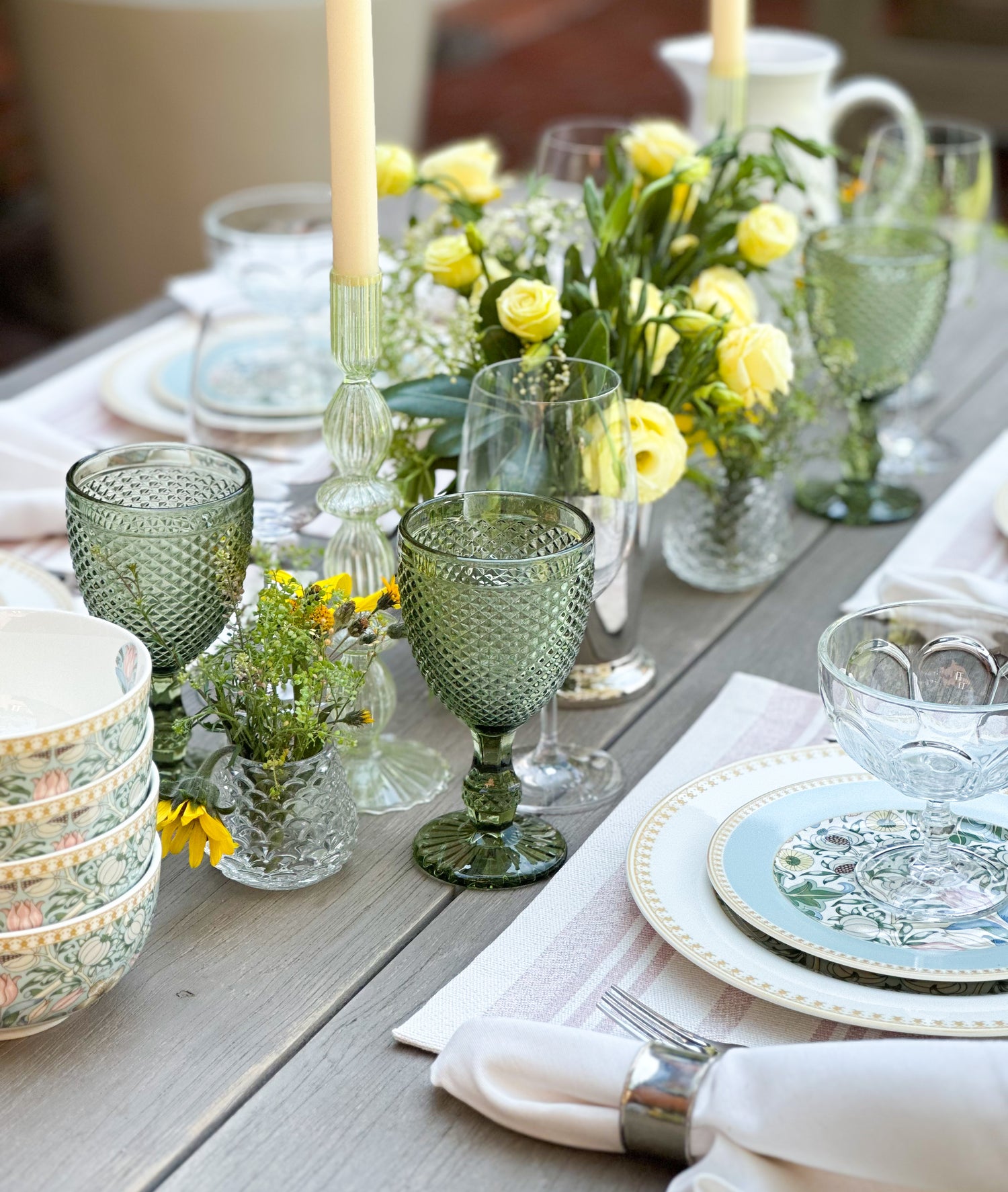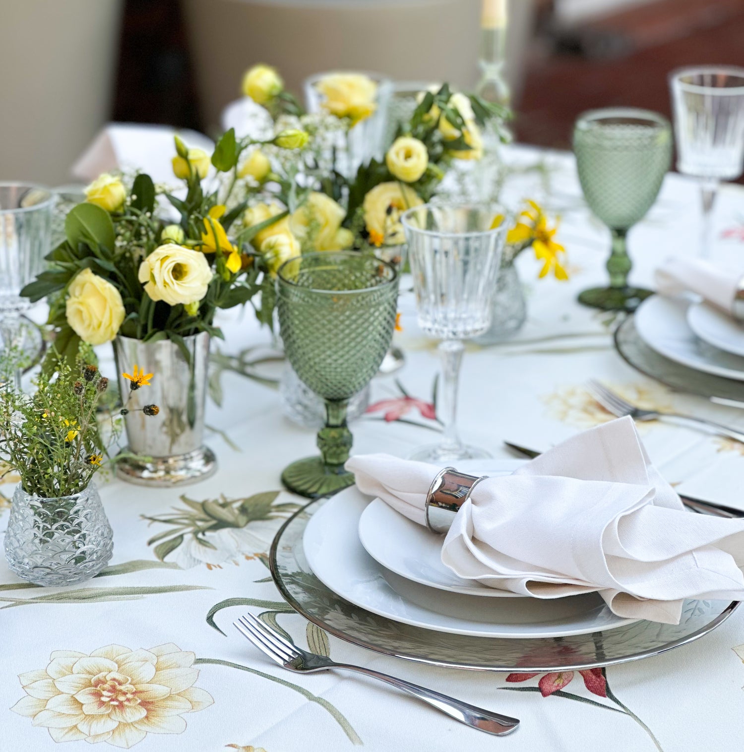 Este look clásico y elegante permite que tu mesa se sienta muy especial. Los arreglos bajos ayudan a la conversación al igual que el mantel hace que sea una mesa acogedora.